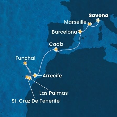 - Fakultatívne výlety v navštívených prístavoch. Lodná spoločnosť má širokú ponuku výletov v každom prístave, na vyžiadanie pošleme prehľad. Výlety sú v týchto jazykoch: anglický, španielsky, taliansky, francúzsky, nemecký. Na plavbách so slovenským delegátom sa konajú výlety v slovenčine.