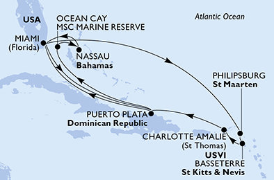 | 13. | 24.02.2028, Št | 13. Ocean Cay MSC Marine Reserve (Ocean Cay) / Bahamy | 08:00 | 18:00 |