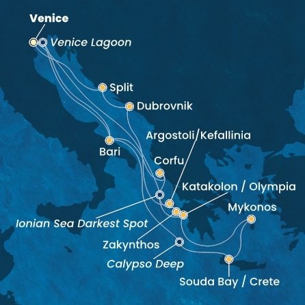 - Sprepitné pre obsluhu na lodi: pre osoby od 15 rokov: 11€/osoba/noc, od 4 do 14,99 rokov vrátane:5,5 €/osoba/noc. Na Plavby od 1.12.2026 sa sprepitné navýši na 12€/osoba/noc, od 4 do 14,99 rokov vrátane: 6€/osoba/noc. NA vybraných plavba s Costa Serena a Diadema sa môže výška sprepitného líšiť.
