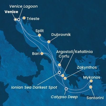- Sprepitné pre obsluhu na lodi: pre osoby od 15 rokov: 11€/osoba/noc, od 4 do 14,99 rokov vrátane:5,5 €/osoba/noc. Na Plavby od 1.12.2026 sa sprepitné navýši na 12€/osoba/noc, od 4 do 14,99 rokov vrátane: 6€/osoba/noc. NA vybraných plavba s Costa Serena a Diadema sa môže výška sprepitného líšiť.